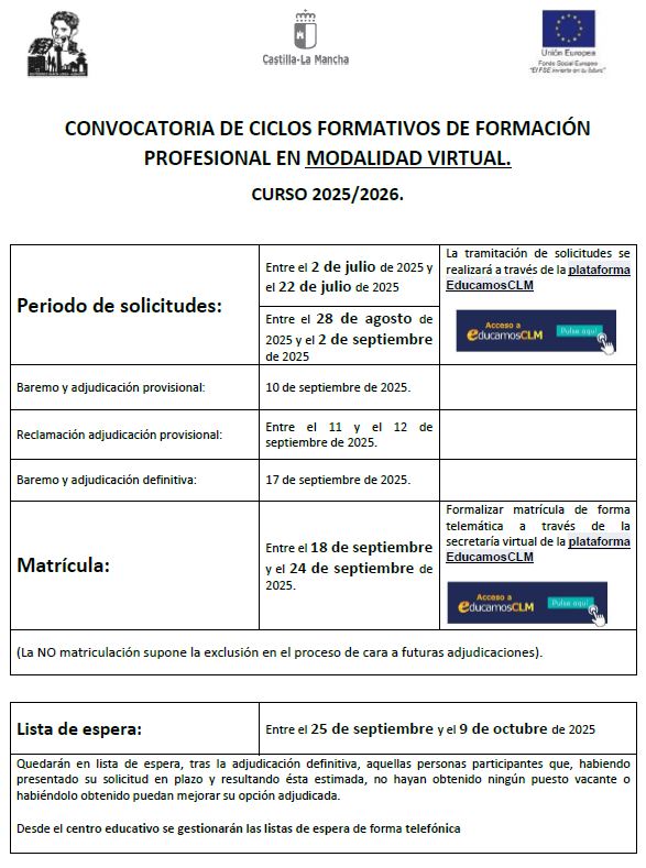 Descargar este archivo (CONVOCATORIA DE CICLOS FORMATIVOS DE FORMACIÓN PROFESIONAL EN MODALIDAD VIRTUAL.pdf)CONVOCATORIA DE CICLOS FORMATIVOS DE FORMACIÓN PROFESIONAL EN MODALIDAD VIRTUAL.pdf[ ]443 kB